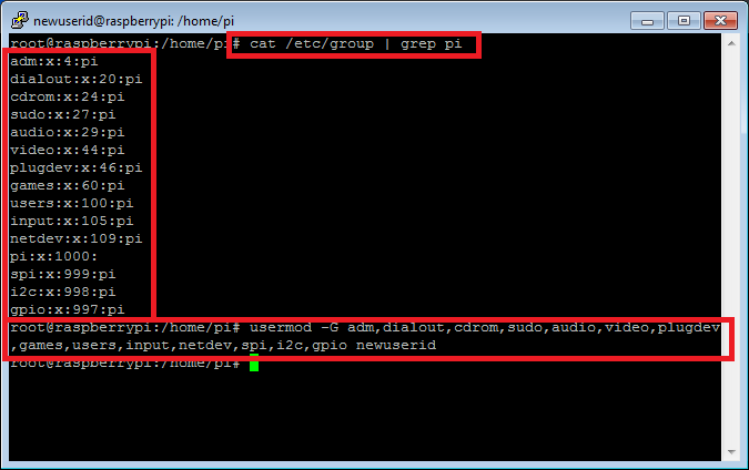 # usermod -G adm,dialout,cdrom,sudo,audio,video,plugdev,games,users,input,netdev,spi,i2c,gpio newuserid