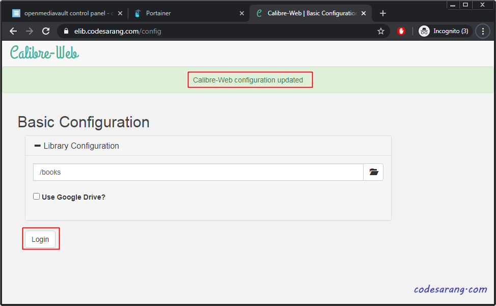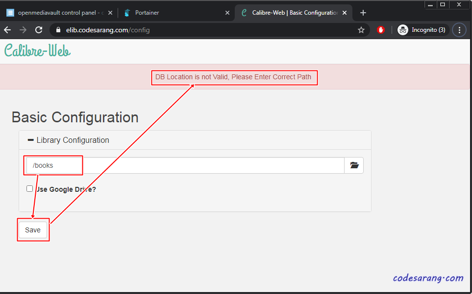 위의 작업을 거쳐 metadata.db 파일을 복사 혹은 생성하였다면 다시 캘리버 웹페이지에서 라이브러리 위치를 "/books"로 설정하고 "Save" 버튼을 누른다.