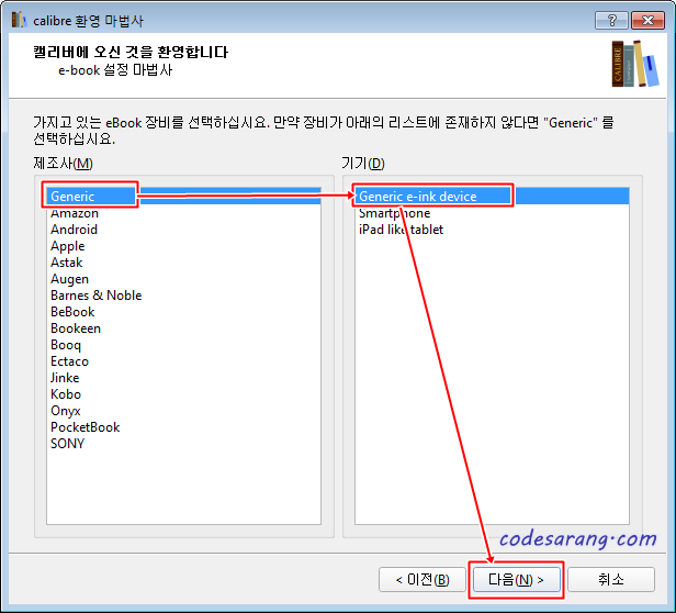 윈도우용 캘리버 프로그램을 설치한 후 최초 실행되는 환경설정 마법사에서 책들 저장 위치를 캘리버 웹의 저장소 위치를 지정한다.