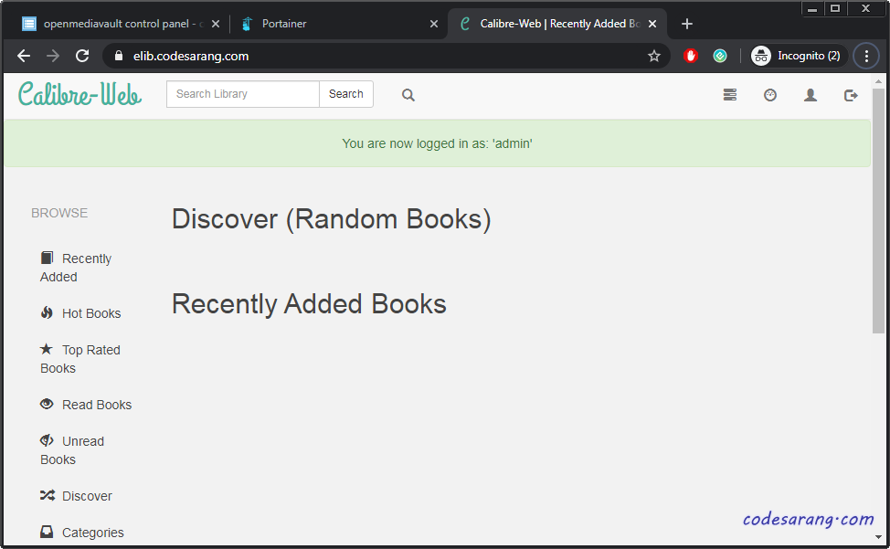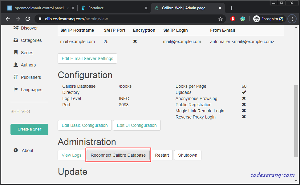 혹시 윈도우용 캘리버에서 전자책을 등록한 후 웹에서 바로 적용이 안될 경우 Admin메뉴에서 "Reconnect Calibre Database" 버튼을 눌러주면 정상 동작한다.