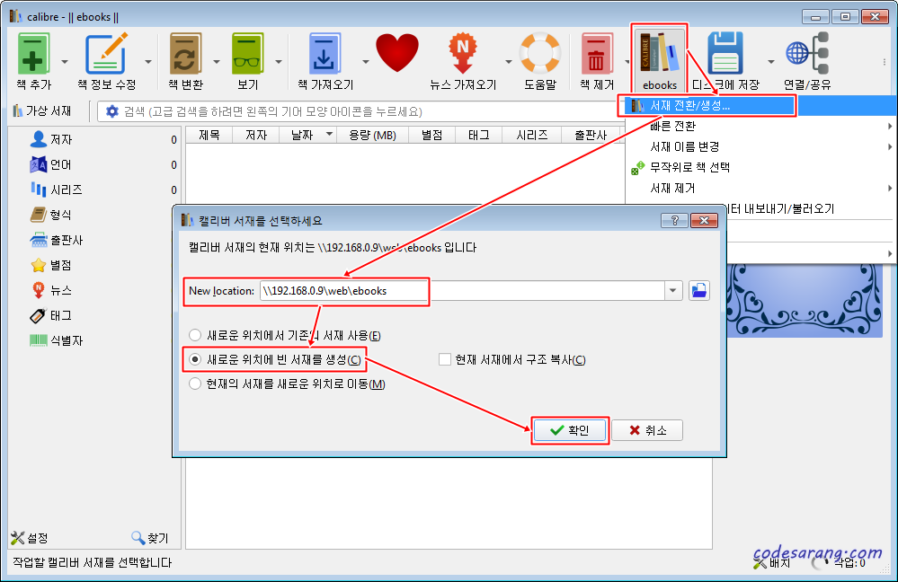 * 주의) 만일 서재 위치에 metadata.db파일이 이미 존재하고 그 내용을 수정하고 싶다면 아래 라디오 버튼에서 "새로운 위치에서 기존의 서재 사용"을 선택해야 한다.