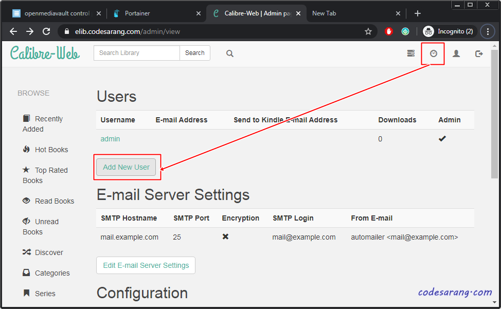 metadata.db 파일을 넣어주는 방법에는 두 가지가 있다. 단순하게는 빈 DB 파일을 컨테이너 "/books"에 바인딩해 놓은 SMB 폴더에 직접 넣어주는 것이다.
