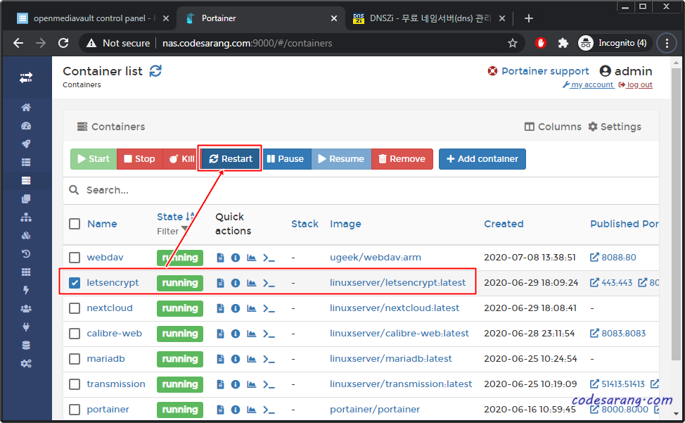 이제 다시 Portainer로 접속, LetsEncrypt 컨테이너를 다시 실행시켜 주기만 하면 된다.